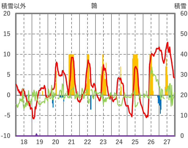 | 日 | 時 | 気温 | 降水 | 風向/風速 | 日照 | 積雪 | 降雪 |