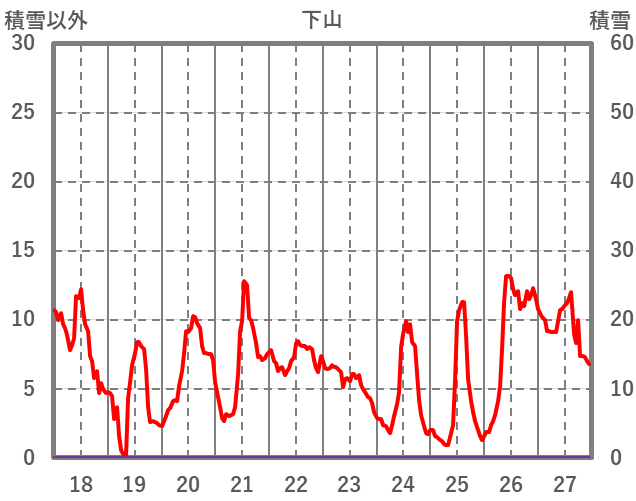 | 日 | 時 | 気温 | 降水 | 風向/風速 | 日照 | 積雪 | 降雪 |