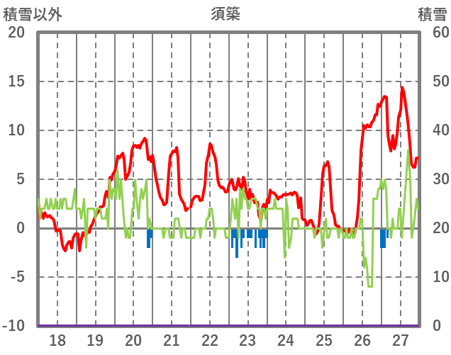 | 日 | 時 | 気温 | 降水 | 風向/風速 | 日照 | 積雪 | 降雪 |
