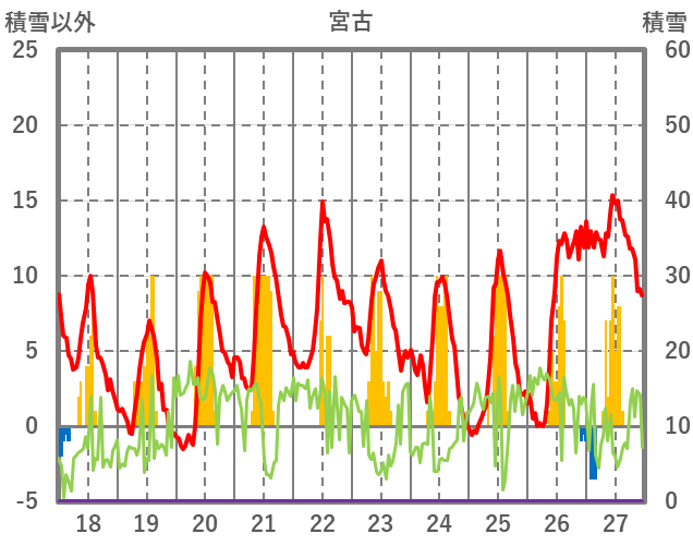 | 日 | 時 | 気温 | 降水 | 風向/風速 | 日照 | 積雪 | 降雪 |
