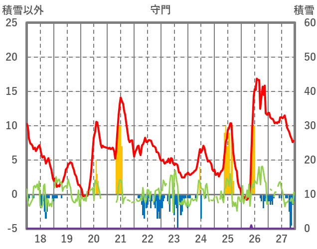 | 日 | 時 | 気温 | 降水 | 風向/風速 | 日照 | 積雪 | 降雪 |