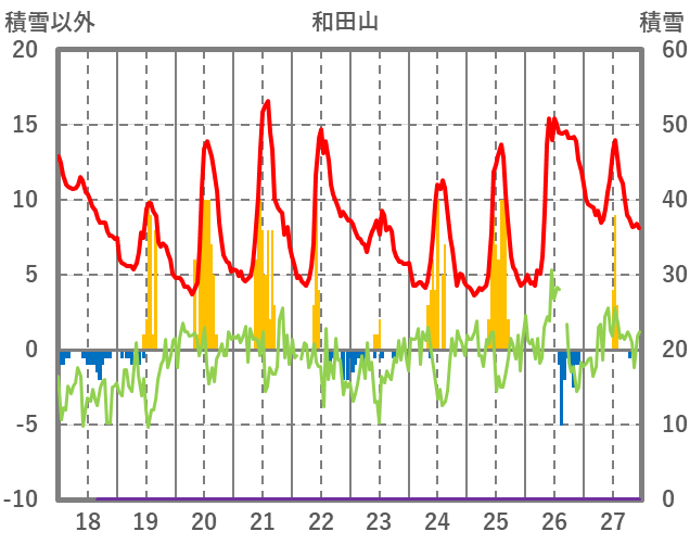 | 日 | 時 | 気温 | 降水 | 風向/風速 | 日照 | 積雪 | 降雪 |
