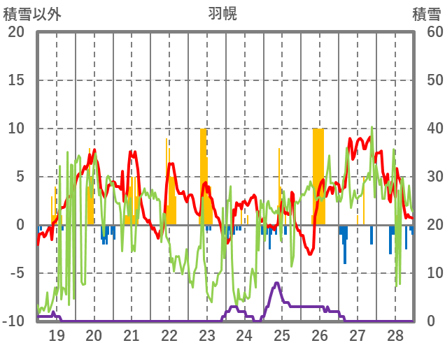 | 日 | 時 | 気温 | 降水 | 風向/風速 | 日照 | 積雪 | 降雪 |
