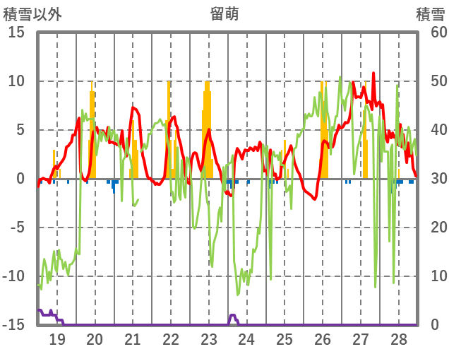 | 日 | 時 | 気温 | 降水 | 風向/風速 | 日照 | 積雪 | 降雪 |