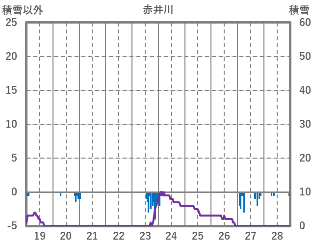 | 日 | 時 | 気温 | 降水 | 風向/風速 | 日照 | 積雪 | 降雪 |