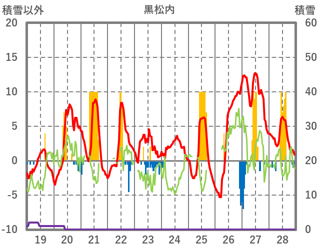 | 日 | 時 | 気温 | 降水 | 風向/風速 | 日照 | 積雪 | 降雪 |