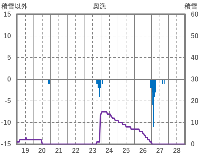 | 日 | 時 | 気温 | 降水 | 風向/風速 | 日照 | 積雪 | 降雪 |