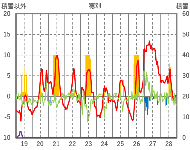 | 日 | 時 | 気温 | 降水 | 風向/風速 | 日照 | 積雪 | 降雪 |