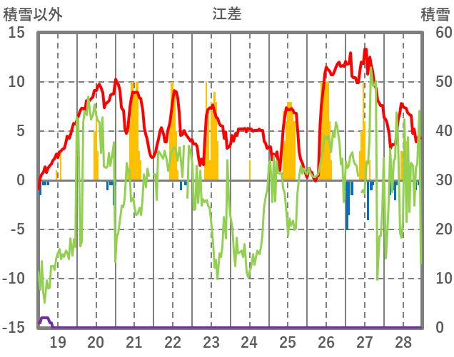 | 日 | 時 | 気温 | 降水 | 風向/風速 | 日照 | 積雪 | 降雪 |