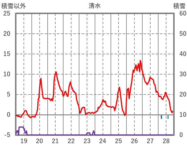| 日 | 時 | 気温 | 降水 | 風向/風速 | 日照 | 積雪 | 降雪 |