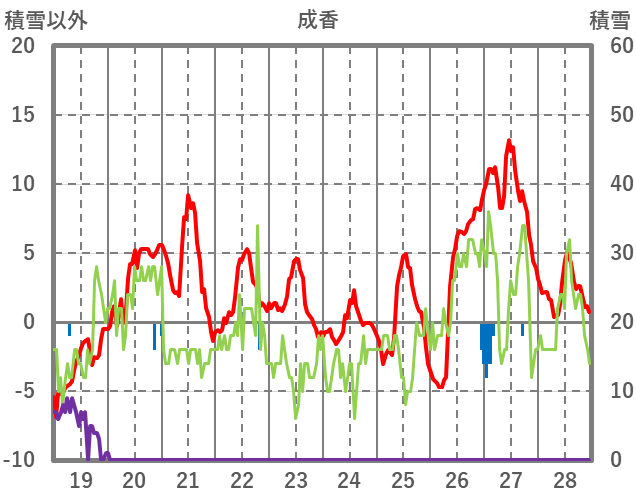 | 日 | 時 | 気温 | 降水 | 風向/風速 | 日照 | 積雪 | 降雪 |