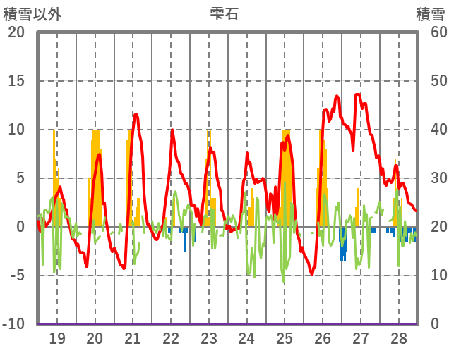 | 日 | 時 | 気温 | 降水 | 風向/風速 | 日照 | 積雪 | 降雪 |