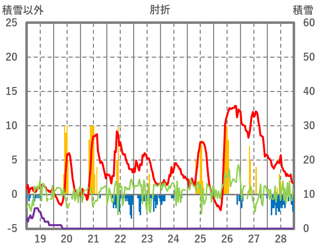 | 日 | 時 | 気温 | 降水 | 風向/風速 | 日照 | 積雪 | 降雪 |