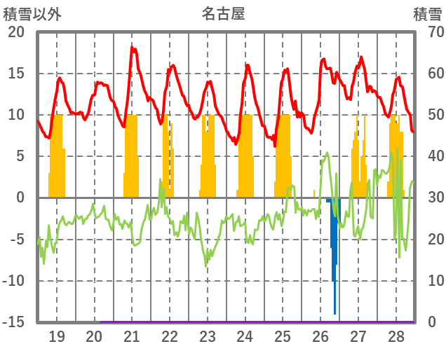 | 日 | 時 | 気温 | 降水 | 風向/風速 | 日照 | 積雪 | 降雪 |