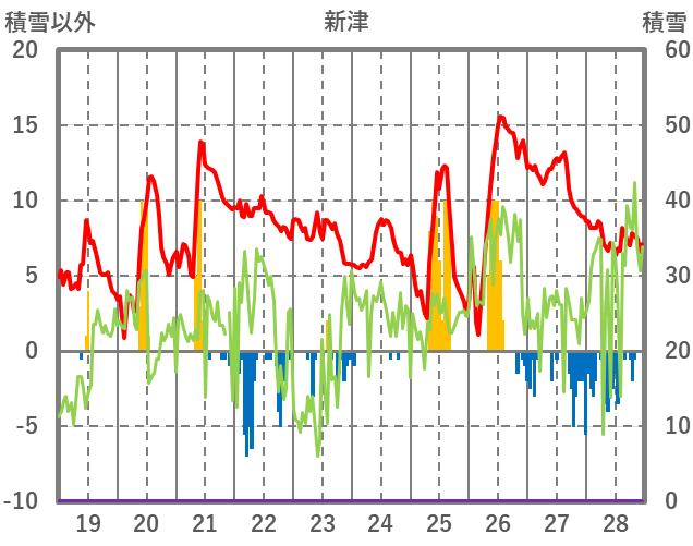 | 日 | 時 | 気温 | 降水 | 風向/風速 | 日照 | 積雪 | 降雪 |