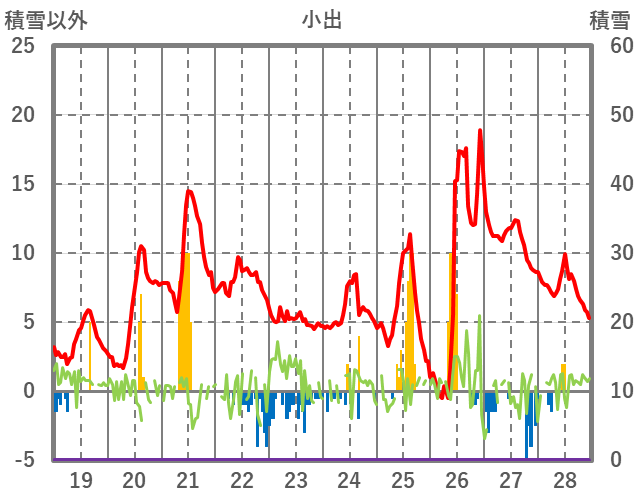 | 日 | 時 | 気温 | 降水 | 風向/風速 | 日照 | 積雪 | 降雪 |