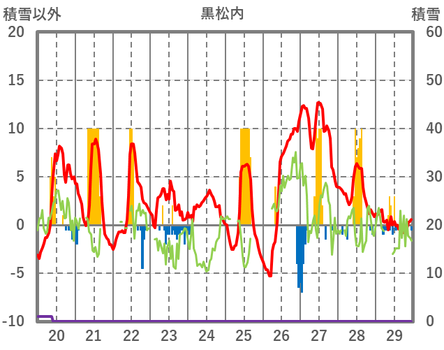 | 日 | 時 | 気温 | 降水 | 風向/風速 | 日照 | 積雪 | 降雪 |