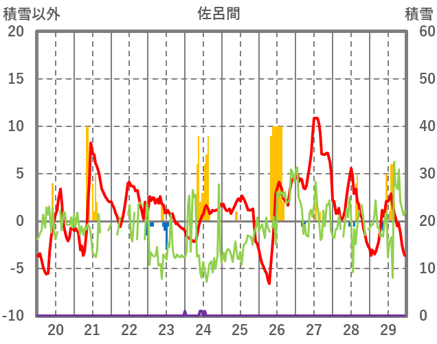 | 日 | 時 | 気温 | 降水 | 風向/風速 | 日照 | 積雪 | 降雪 |