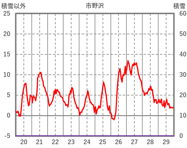 | 日 | 時 | 気温 | 降水 | 風向/風速 | 日照 | 積雪 | 降雪 |