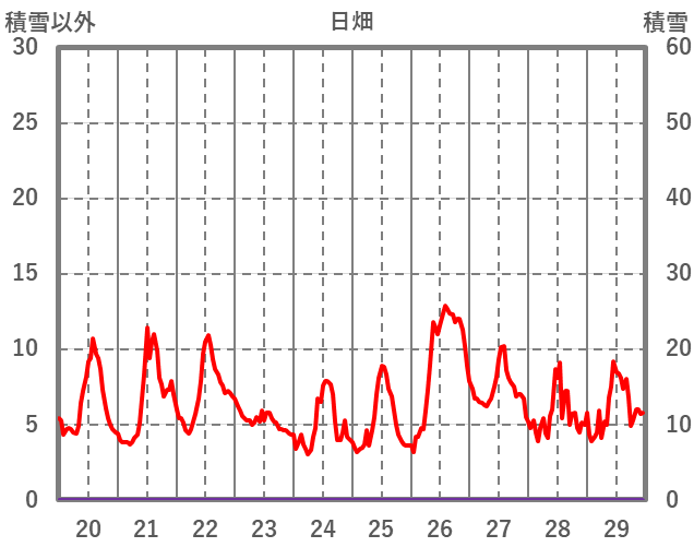 | 日 | 時 | 気温 | 降水 | 風向/風速 | 日照 | 積雪 | 降雪 |