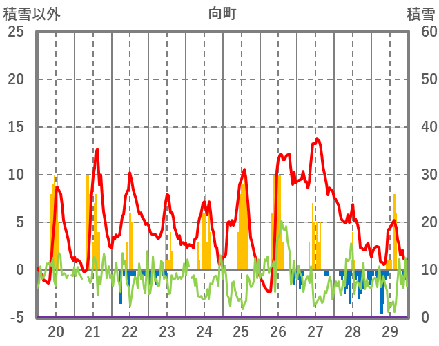 | 日 | 時 | 気温 | 降水 | 風向/風速 | 日照 | 積雪 | 降雪 |