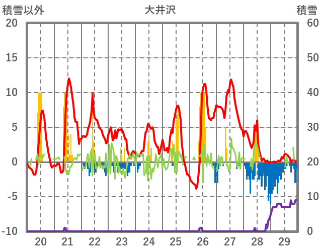 | 日 | 時 | 気温 | 降水 | 風向/風速 | 日照 | 積雪 | 降雪 |