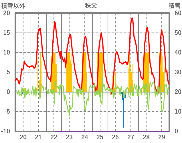 | 日 | 時 | 気温 | 降水 | 風向/風速 | 日照 | 積雪 | 降雪 |