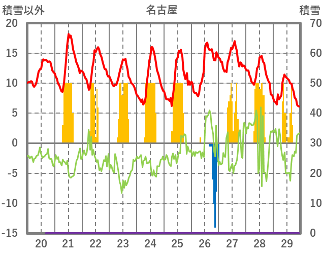 | 日 | 時 | 気温 | 降水 | 風向/風速 | 日照 | 積雪 | 降雪 |
