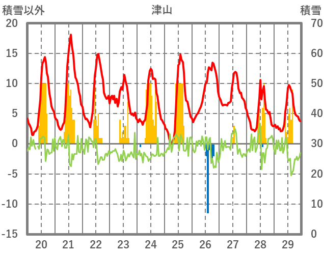 | 日 | 時 | 気温 | 降水 | 風向/風速 | 日照 | 積雪 | 降雪 |
