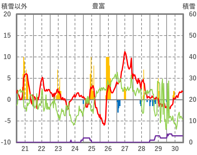 | 日 | 時 | 気温 | 降水 | 風向/風速 | 日照 | 積雪 | 降雪 |