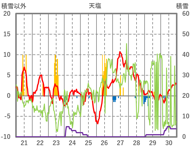 | 日 | 時 | 気温 | 降水 | 風向/風速 | 日照 | 積雪 | 降雪 |