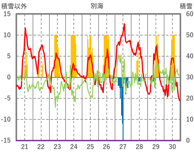 | 日 | 時 | 気温 | 降水 | 風向/風速 | 日照 | 積雪 | 降雪 |