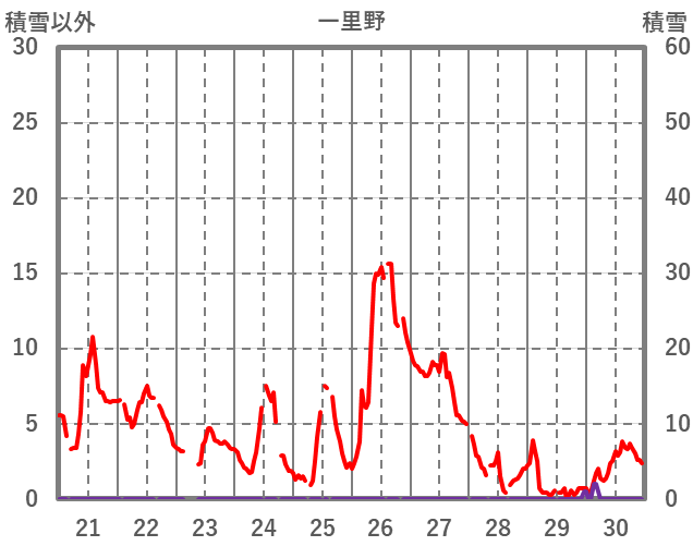 | 日 | 時 | 気温 | 降水 | 風向/風速 | 日照 | 積雪 | 降雪 |