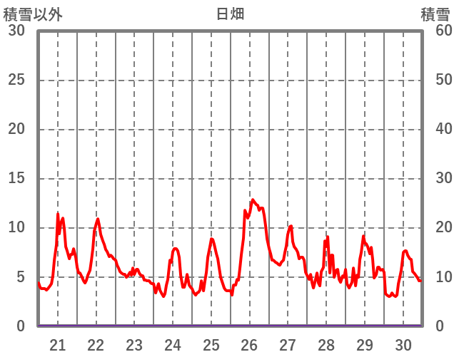 | 日 | 時 | 気温 | 降水 | 風向/風速 | 日照 | 積雪 | 降雪 |