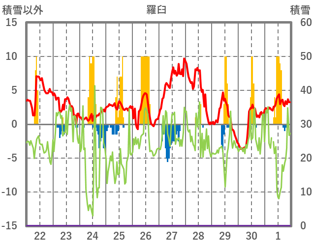 | 日 | 時 | 気温 | 降水 | 風向/風速 | 日照 | 積雪 | 降雪 |