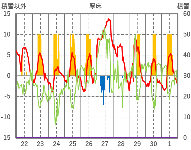 | 日 | 時 | 気温 | 降水 | 風向/風速 | 日照 | 積雪 | 降雪 |