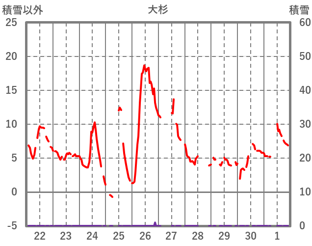 | 日 | 時 | 気温 | 降水 | 風向/風速 | 日照 | 積雪 | 降雪 |