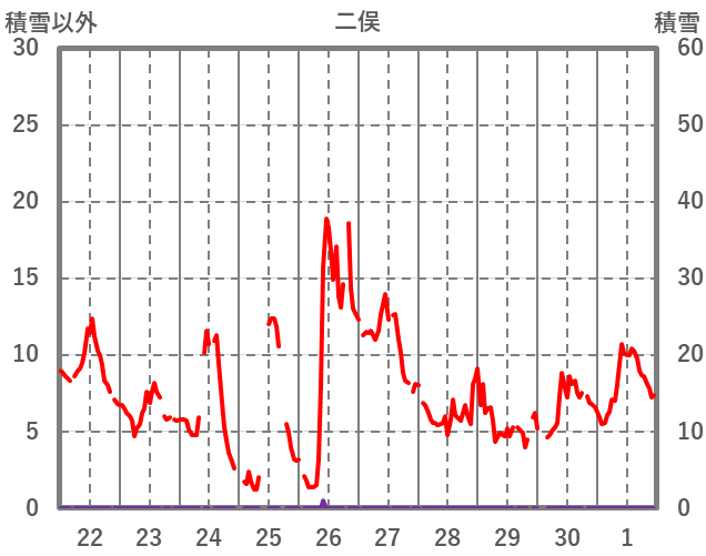| 日 | 時 | 気温 | 降水 | 風向/風速 | 日照 | 積雪 | 降雪 |