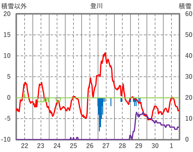| 日 | 時 | 気温 | 降水 | 風向/風速 | 日照 | 積雪 | 降雪 |