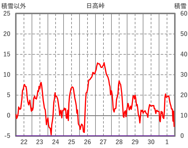 | 日 | 時 | 気温 | 降水 | 風向/風速 | 日照 | 積雪 | 降雪 |