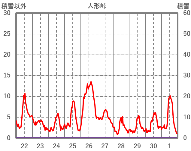 | 日 | 時 | 気温 | 降水 | 風向/風速 | 日照 | 積雪 | 降雪 |