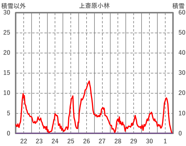 | 日 | 時 | 気温 | 降水 | 風向/風速 | 日照 | 積雪 | 降雪 |