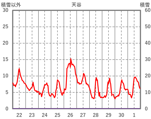 | 日 | 時 | 気温 | 降水 | 風向/風速 | 日照 | 積雪 | 降雪 |