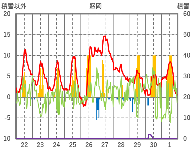 | 日 | 時 | 気温 | 降水 | 風向/風速 | 日照 | 積雪 | 降雪 |