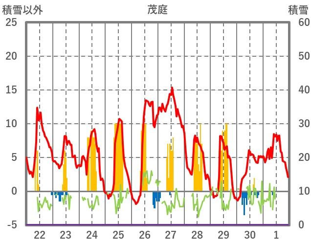 | 日 | 時 | 気温 | 降水 | 風向/風速 | 日照 | 積雪 | 降雪 |