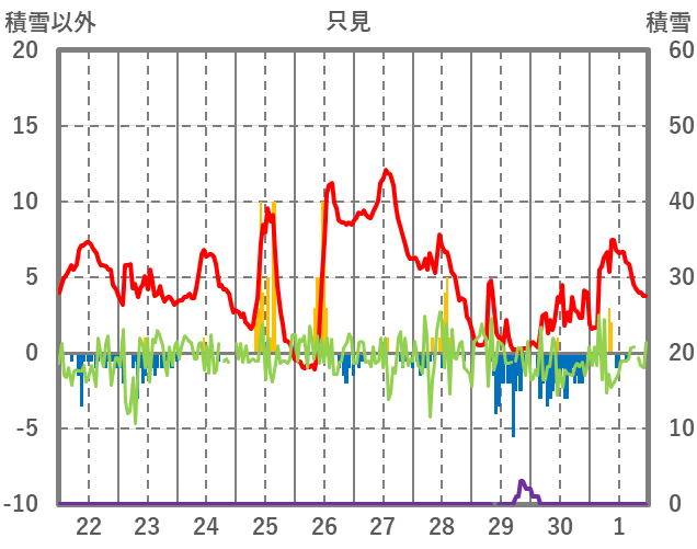 | 日 | 時 | 気温 | 降水 | 風向/風速 | 日照 | 積雪 | 降雪 |