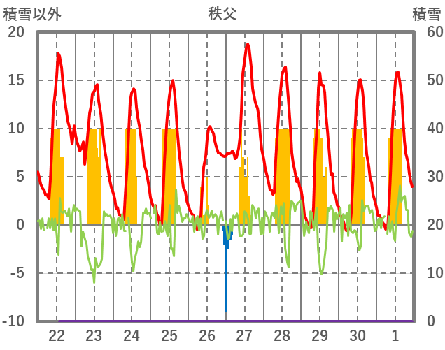 | 日 | 時 | 気温 | 降水 | 風向/風速 | 日照 | 積雪 | 降雪 |