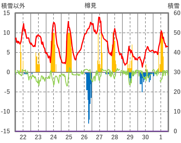 | 日 | 時 | 気温 | 降水 | 風向/風速 | 日照 | 積雪 | 降雪 |