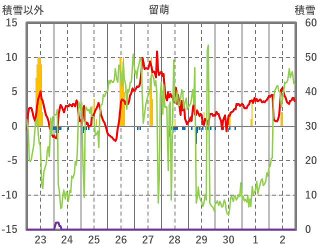 | 日 | 時 | 気温 | 降水 | 風向/風速 | 日照 | 積雪 | 降雪 |