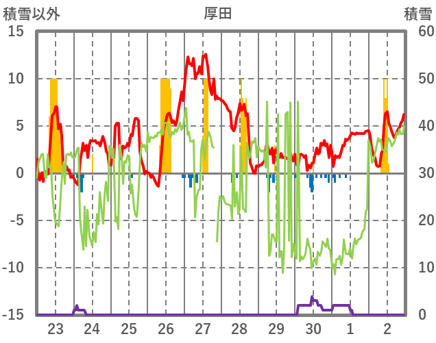 | 日 | 時 | 気温 | 降水 | 風向/風速 | 日照 | 積雪 | 降雪 |